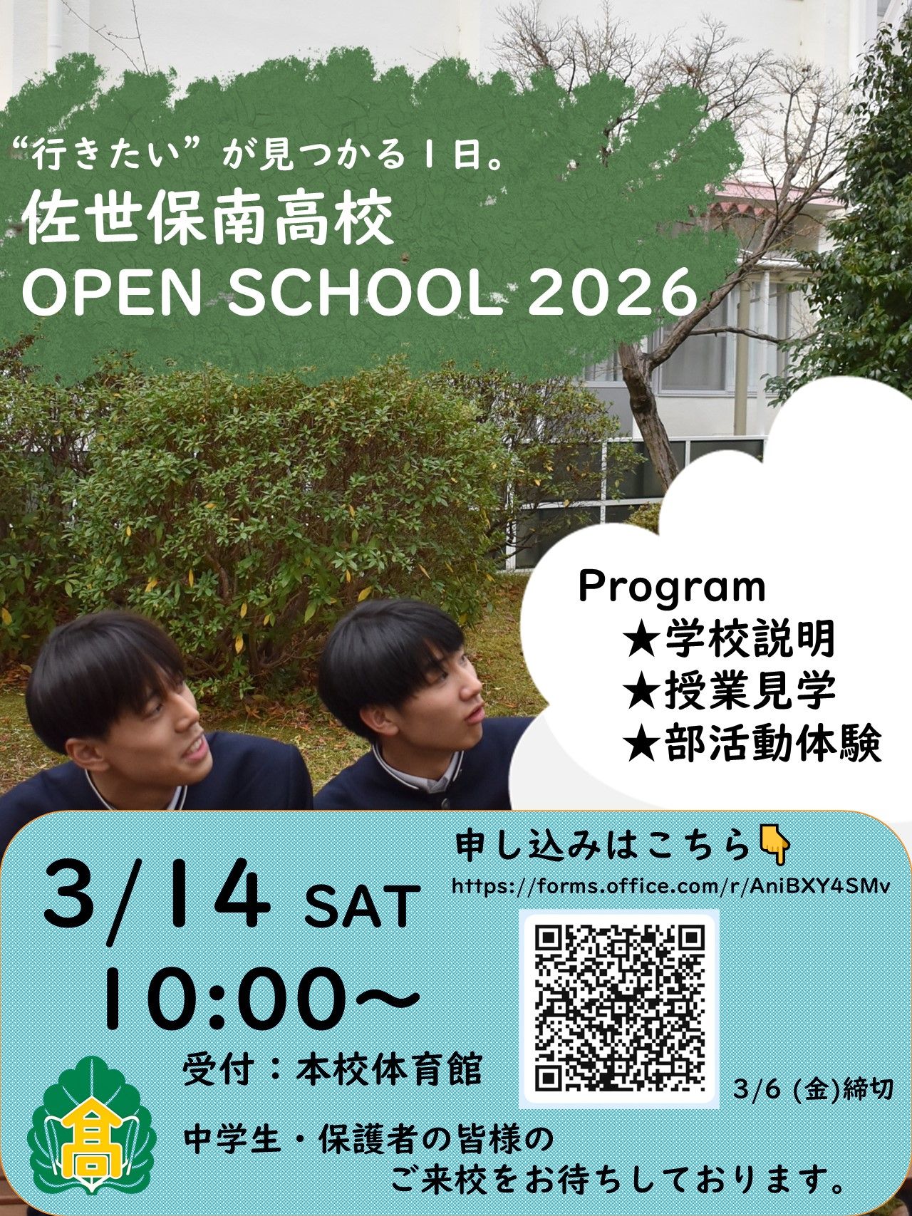 本校について2022/3/2 12:122026/1/3 13:27入学希望の方へ2022/3/2 12:132026/1/3 12:21在校生の方へ2022/3/2 12:132026/1/3 12:21保護者の方へ2022/3/3 17:042026/1/3 12:21卒業生の方へ2022/3/2 12:132026/1/3 12:21Copyright © Sasebo Minami High School, All rights reserved